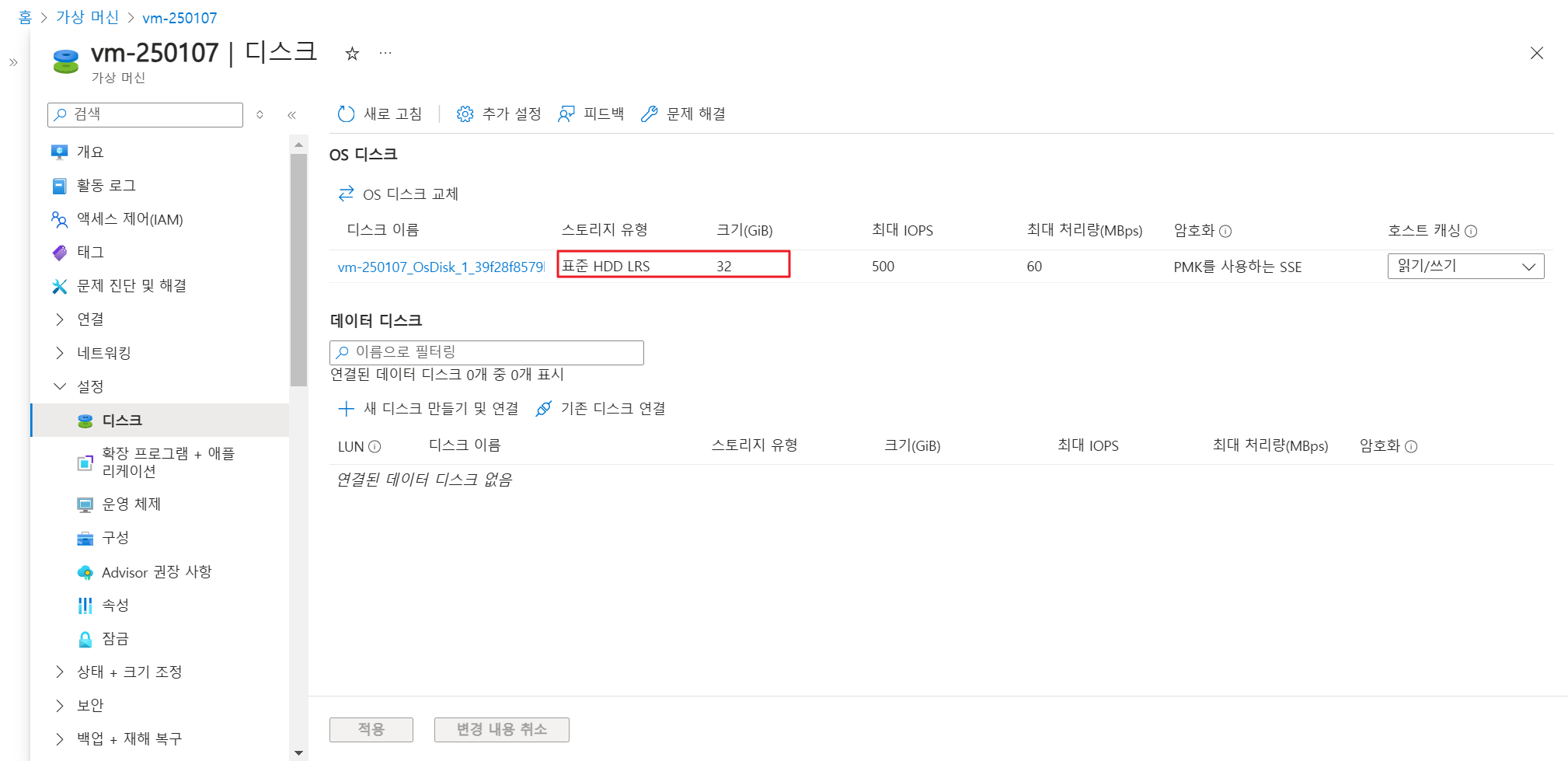 9. Azure Portal에서 디스크 크기를 확인한다.