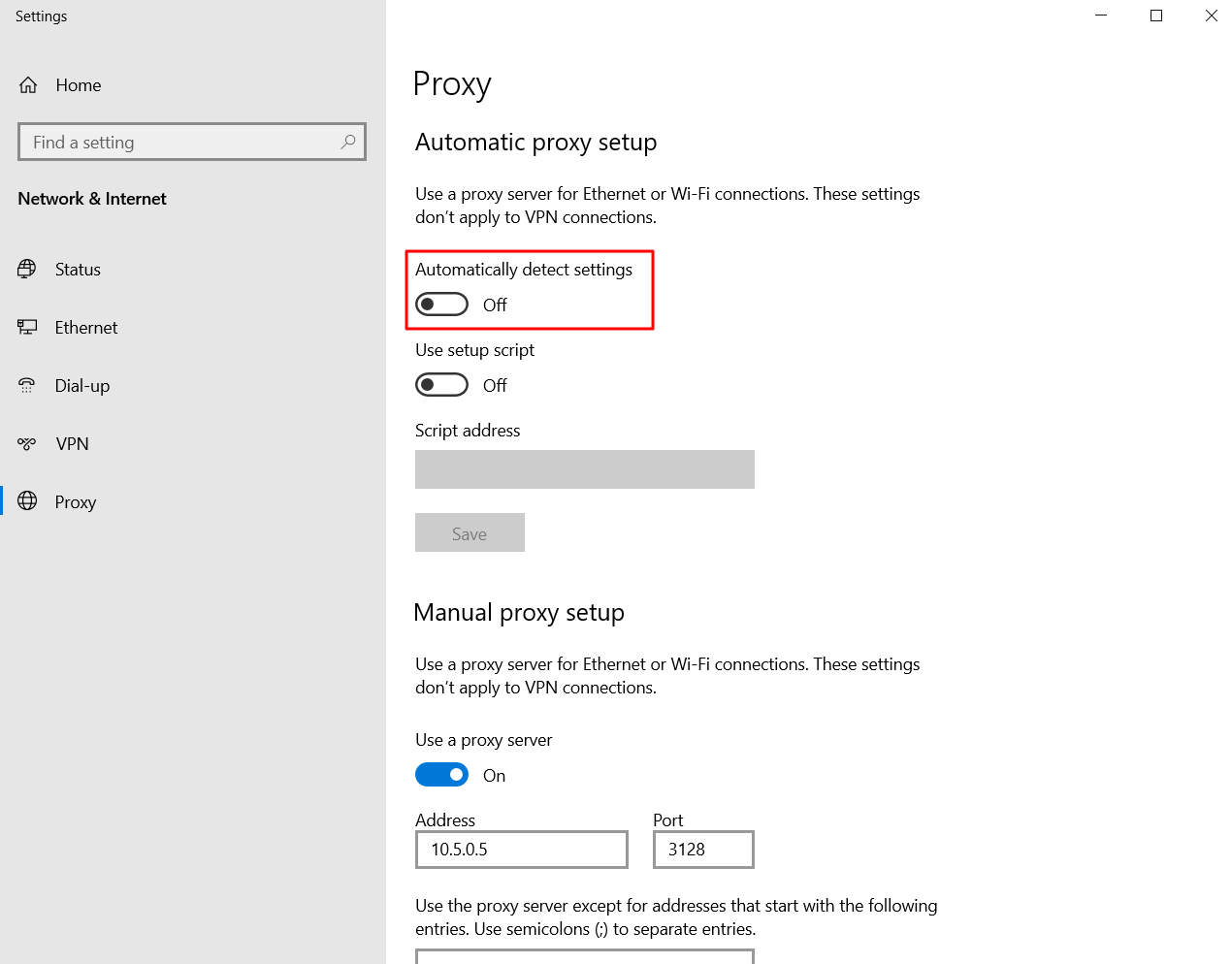 Automatically detect settings는 off