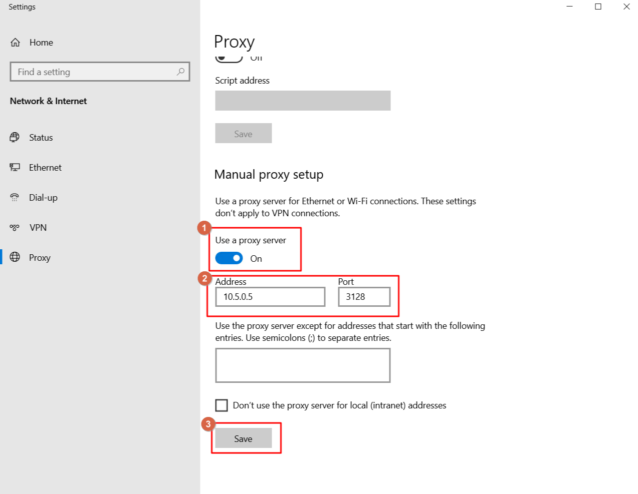 Proxy 서버의 사설 IP와 포트 3128 지정 후 Save