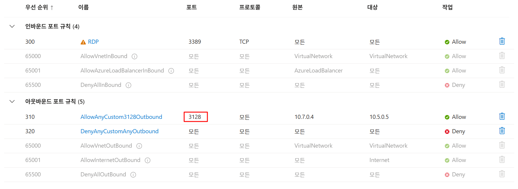 - 아웃바운드 : port 3128 / source : Client VM 사설 IP / target : Proxy VM 사설 IP