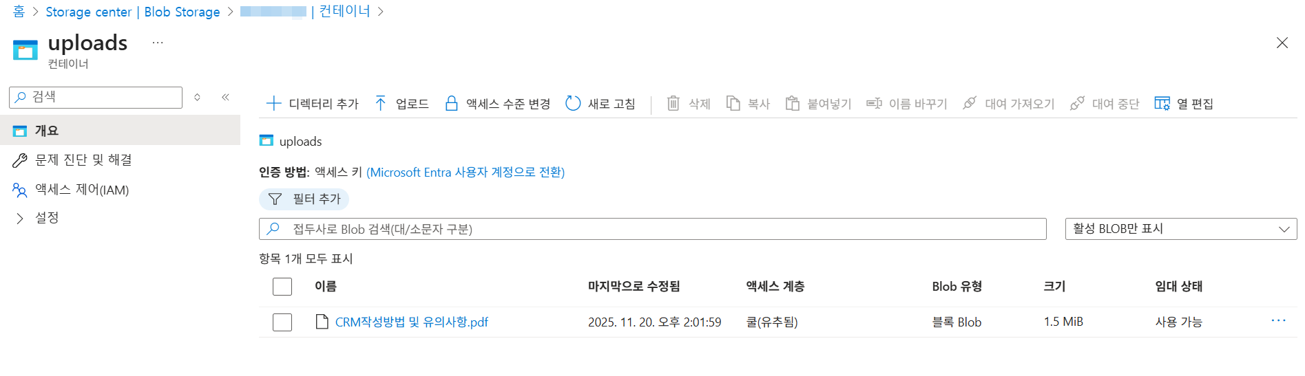 업로드 한 문서가 blob에도 업로드 된 것을 확인 가능하다.