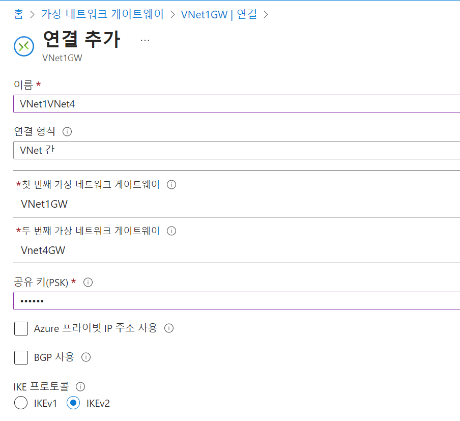 - 공유 키: 공유 키를 직접 만들 수 있습니다. VNet 간 연결을 만들 때 값이 일치해야 합니다. 이 연습에서는 abc123을 사용합니다.
