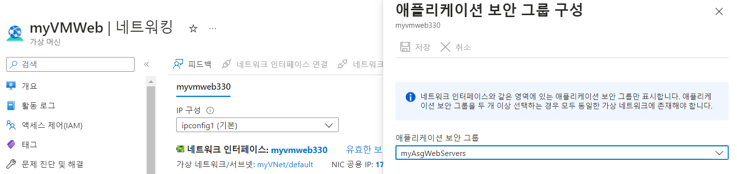 myVMWeb 가상머신 - 네트워킹 - 애플리케이션 보안그룹 myASGWebServers에 추가