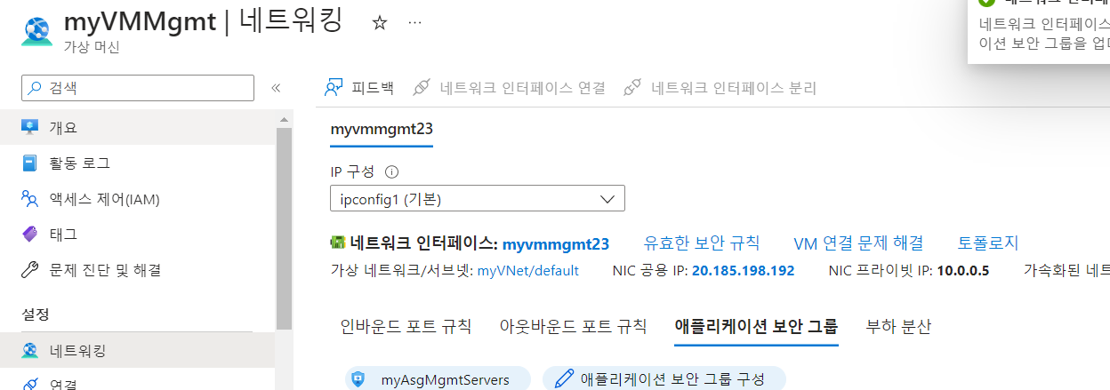 myVMMgmt 가상머신 - 네트워킹 - 애플리케이션 보안그룹 myASGMgmtServers에 추가