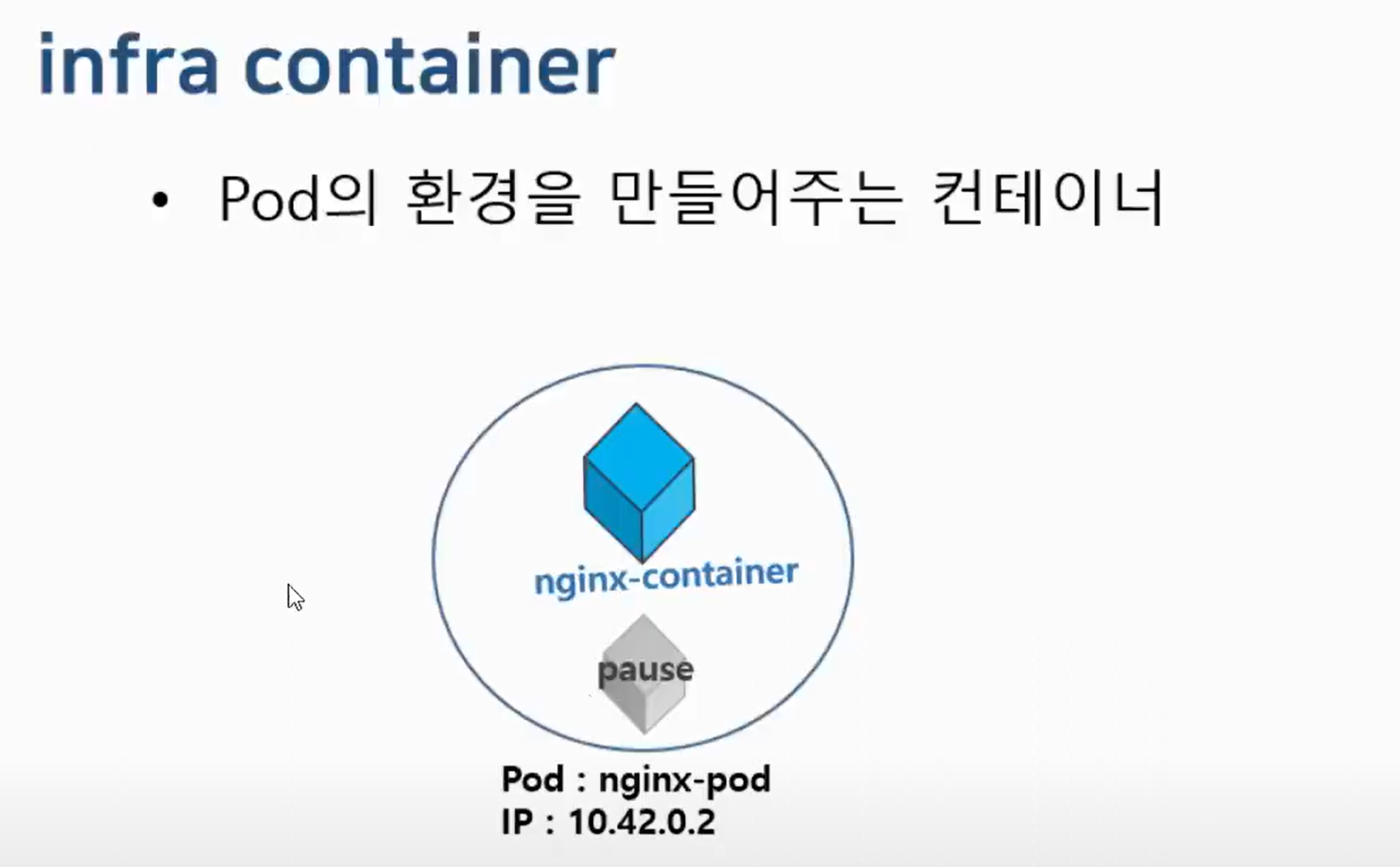 - Pod의 환경을 만들어주는 컨테이너 (Pod 대한 IP, hostname 관리 및 생성하는 컨테이너)