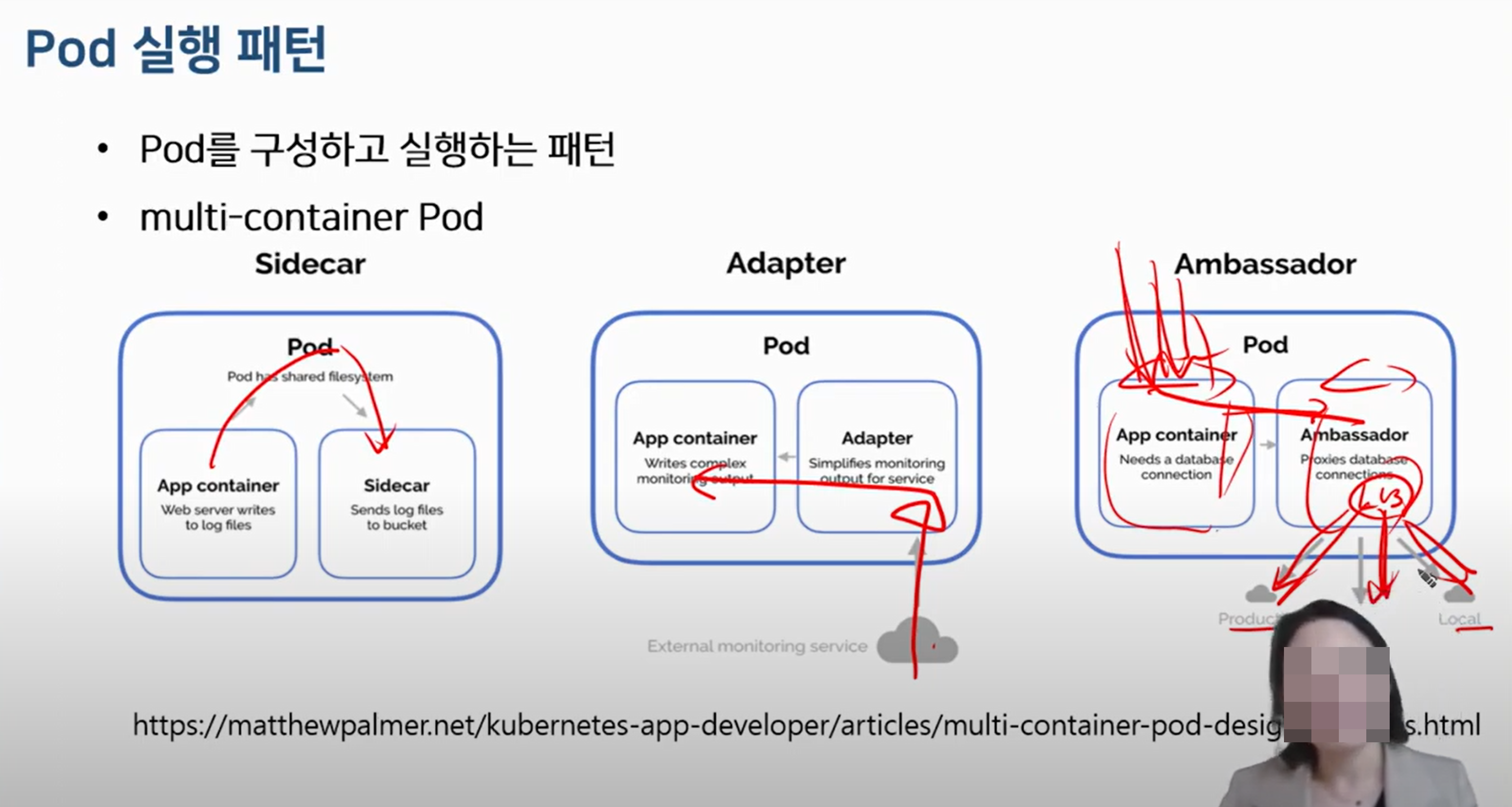 - Kubernetes에서 멀티 컨테이너 포드(Multi-Container Pod)는 여러 개의 컨테이너가 하나의 포드 내에서 함께 실행되는 구조입니다. 이러한 구조의 주요 종류는 다음과 같습니다.