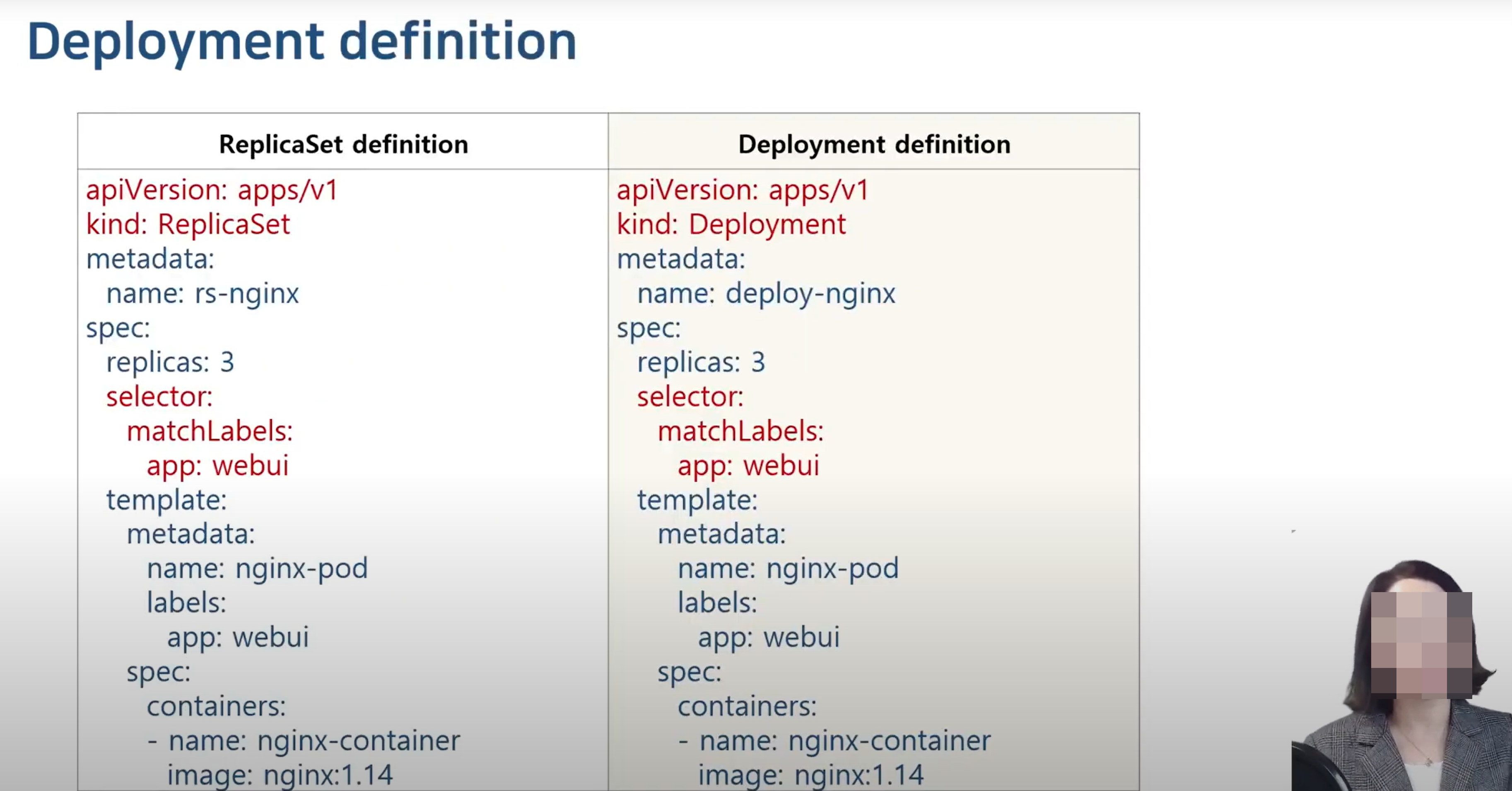 ReplicaSet과 Deployment definition의 차이점이 크게 없다. (kind만 달라짐)