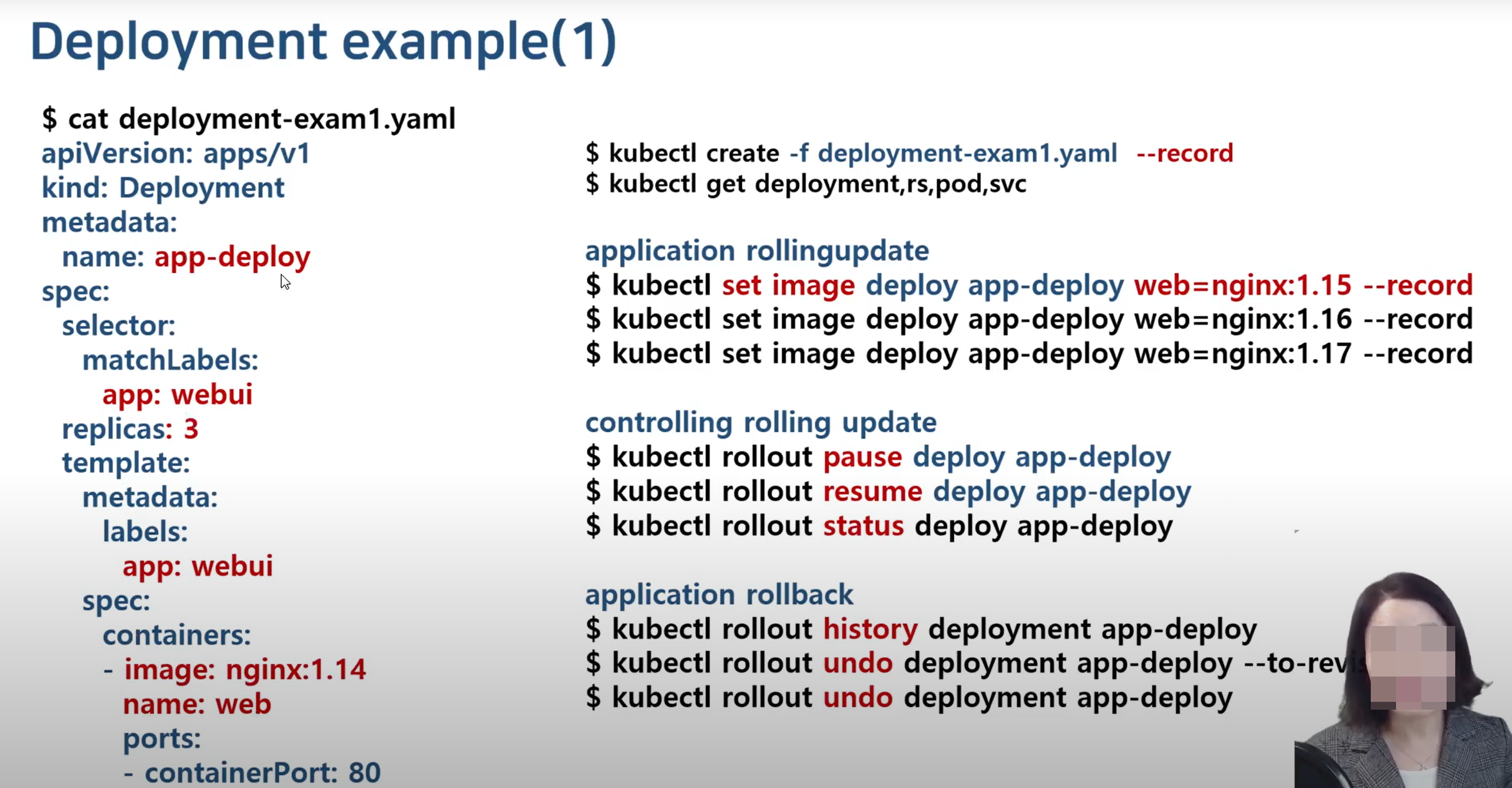 kubectl rollout status deployment app-deploy # 상태 확인 kubectl rollout pause deployment app-deploy # 업데이트 중지 kubectl rollout resume deployment app-deploy # 업데이트 재개참고로, Rolling update 진행 시 상태 확인 / 중단 / 재개도 해당 명령어로 가능합니당