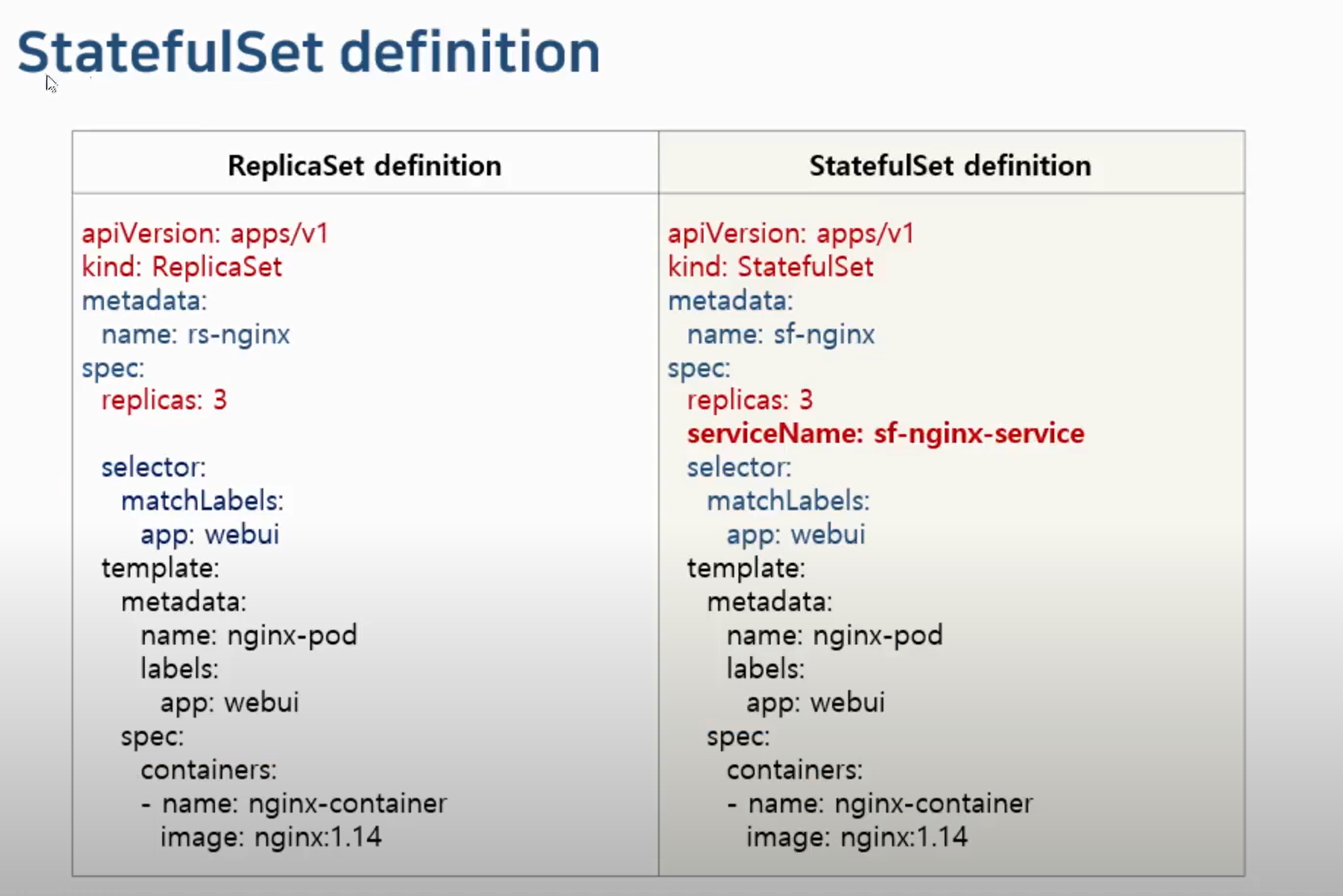 root@master:~/Getting-Start-Kubernetes/6# cat statefulset-exam.yaml apiVersion: apps/v1 kind: StatefulSet metadata: name: sf-nginx spec: replicas: 3 serviceName: sf-service # podManagementPolicy: OrderedReady podManagementPolicy: Parallel selector: matchLabels: app: webui template: metadata: name: nginx-pod labels: app: webui spec: containers: - name: nginx-container*podManagedPolicy : OrderedReady (Default 값)