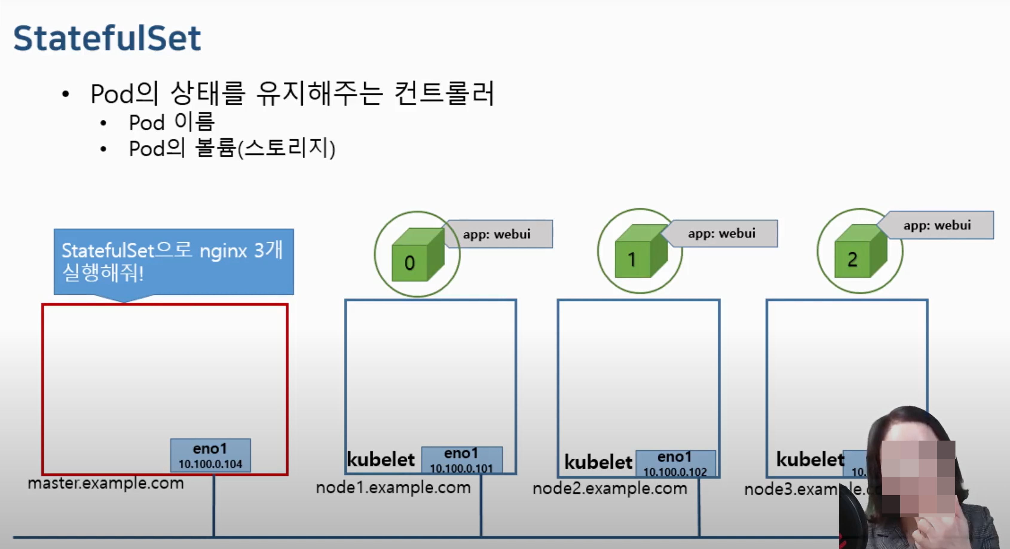 DaemonSet과 다른 점은, StatefulSet은 node당 한 개의 pod만 보장하지 않는다는 점이다.