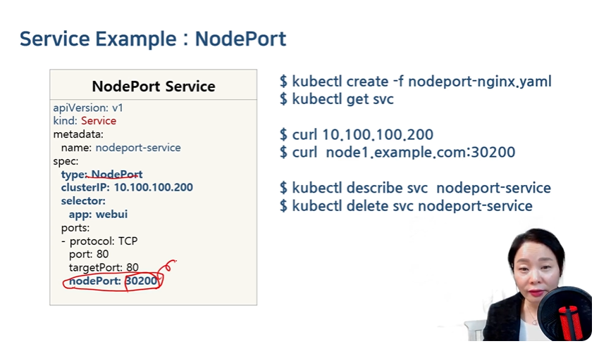 root@master:~/Getting-Start-Kubernetes/7# kubectl get svc NAME TYPE CLUSTER-IP EXTERNAL-IP PORT(S) AG E m kubernetes ClusterIP 10.96.0.1 <none> 443/TCP 34 d nodeport-service NodePort 10.100.100.200 <none> 80:30200/TCP 81 sclusterIP 10.100.100.200, port는 80